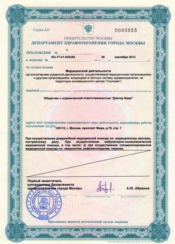 Среди предлагаемых процедур вы можете выбрать остеопатию, биорезонансную терапию, мануальную терапию, лечебный массаж, техники восточной медицины, гирудотерапию, тонизирующие процедуры, очищение организма, реабилитацию после травм или операций. По вашему запросу мы сможем быстро предоставить бумаги с результатами.